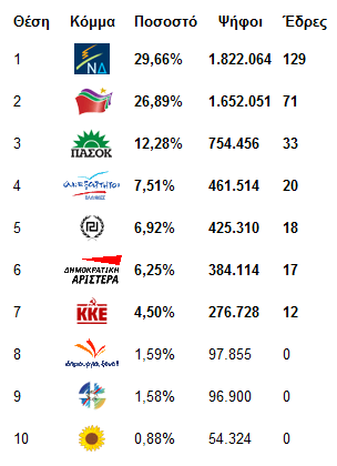Το εκλογικό αποτέλεσμα της 6ης Μαΐου εγκαινιάζει μια νέα περίοδο «δύναμης του αδύνατου», που παραμένει αδύνατος και «αδυναμίας του δυνατού», που παραμένει ωστόσο δυνατός. Μια πρώτη διαφιλονικούμενη καταδίκη των πολιτικών του Μνημονίου και του δικομματισμού. Από τους 3.300.000 ψηφοφόρους, οι οποίοι απομακρύνθηκαν από ΠΑΣΟΚ, ΝΔ και ΛΑΟΣ , 1.250.000 στράφηκαν προς την Αριστερά (συνυπολογίζεται αφαιρετικά και η ΔΗΜΑΡ), 1.300.000 σε αστικά και ακροδεξιά κόμματα – συν 440.000 στη Χρυσή Αυγή – και περίπου 600.000 προτίμησαν την αποχή. Για πρώτη φορά μεταπολεμικά 2.200.000, το 31% περίπου του εκλογικού σώματος (26% ΣΥΡΙΖΑ, ΚΚΕ, ΑΝΤΑΡΣΥΑ), στέκεται θετικά, ιδιαίτερα σε εργατουπόλεις και εργατοσυνοικίες, στην υπάρχουσα Αριστερά.