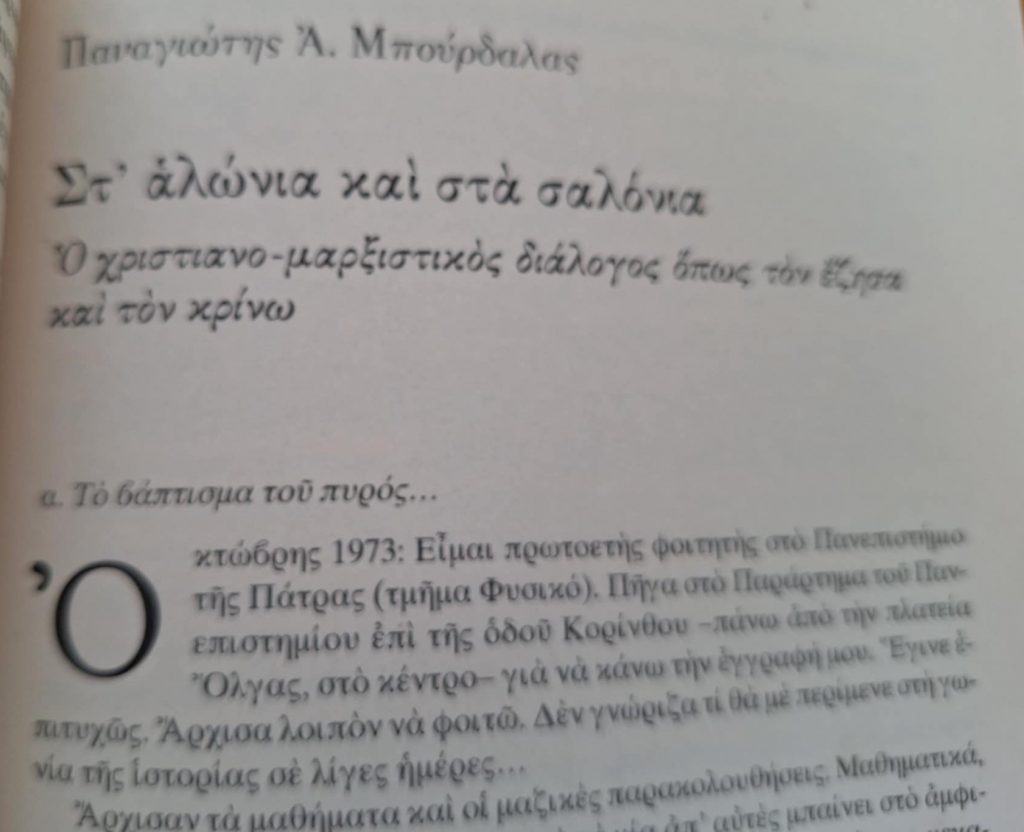 Η συμμετοχή μου στα γεγονότα του Νοέμβρη του ’73 μου έδωσε ένα τεράστιο πλεονέκτημα για την έναρξη ενός νέου γύρου χριστιανο-μαρξιστικού διαλόγου στα αμφιθέατρα, στα πηγαδάκια και στις συνελεύσεις των τμημάτων. Αυτό το είχαν άλλοι δύο συμφοιτητές μου, που είχαν σχέση με την «Χριστιανική».